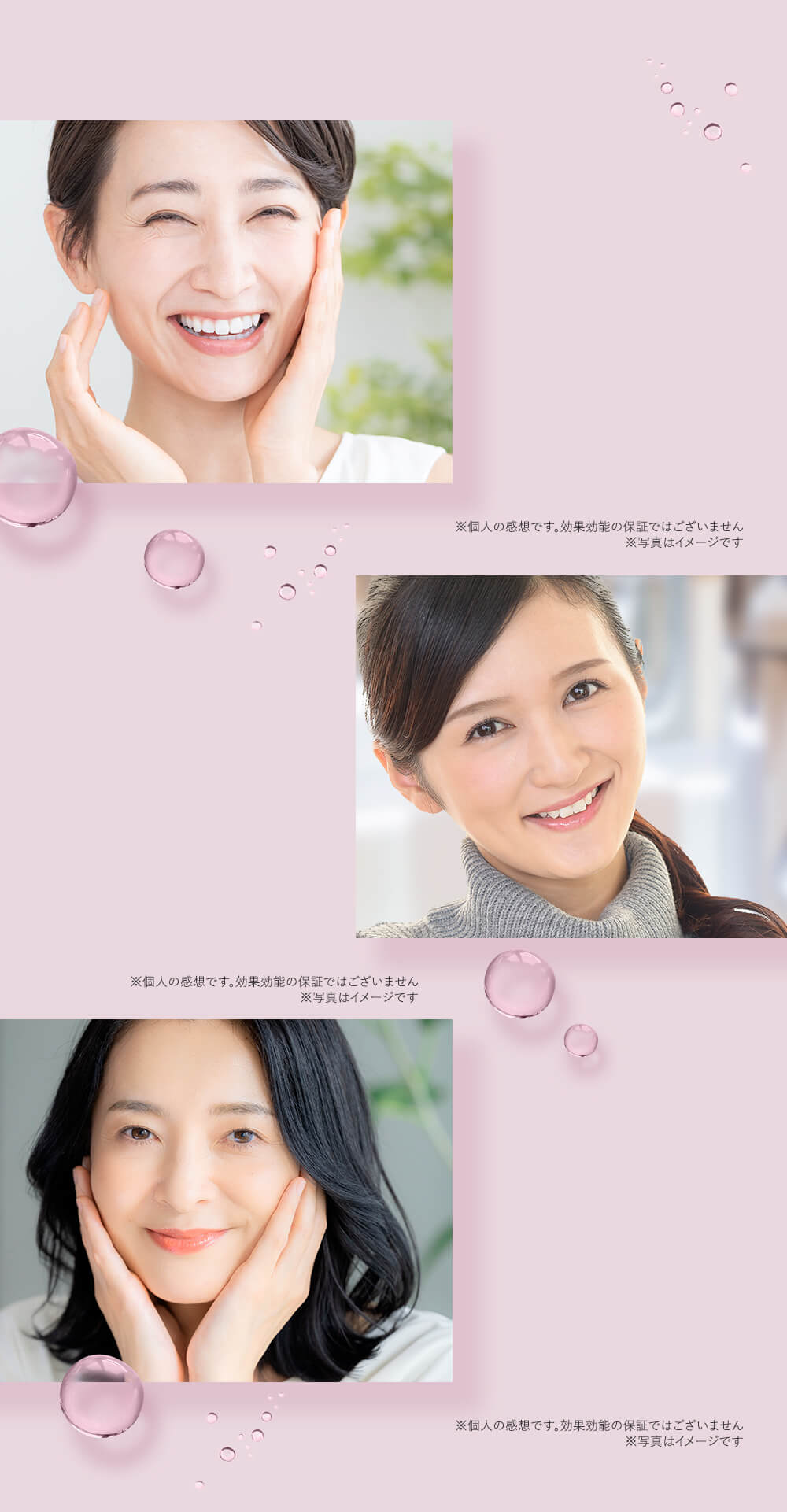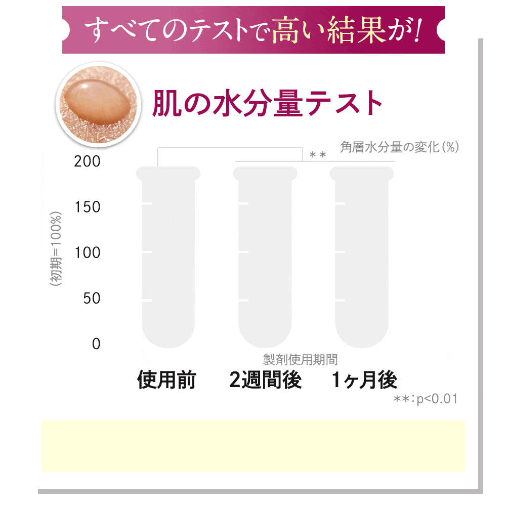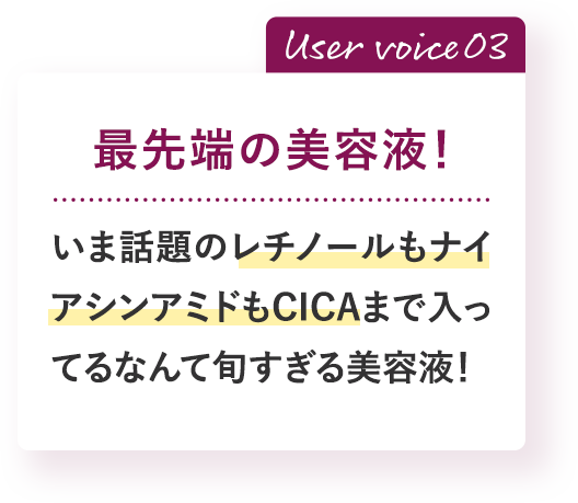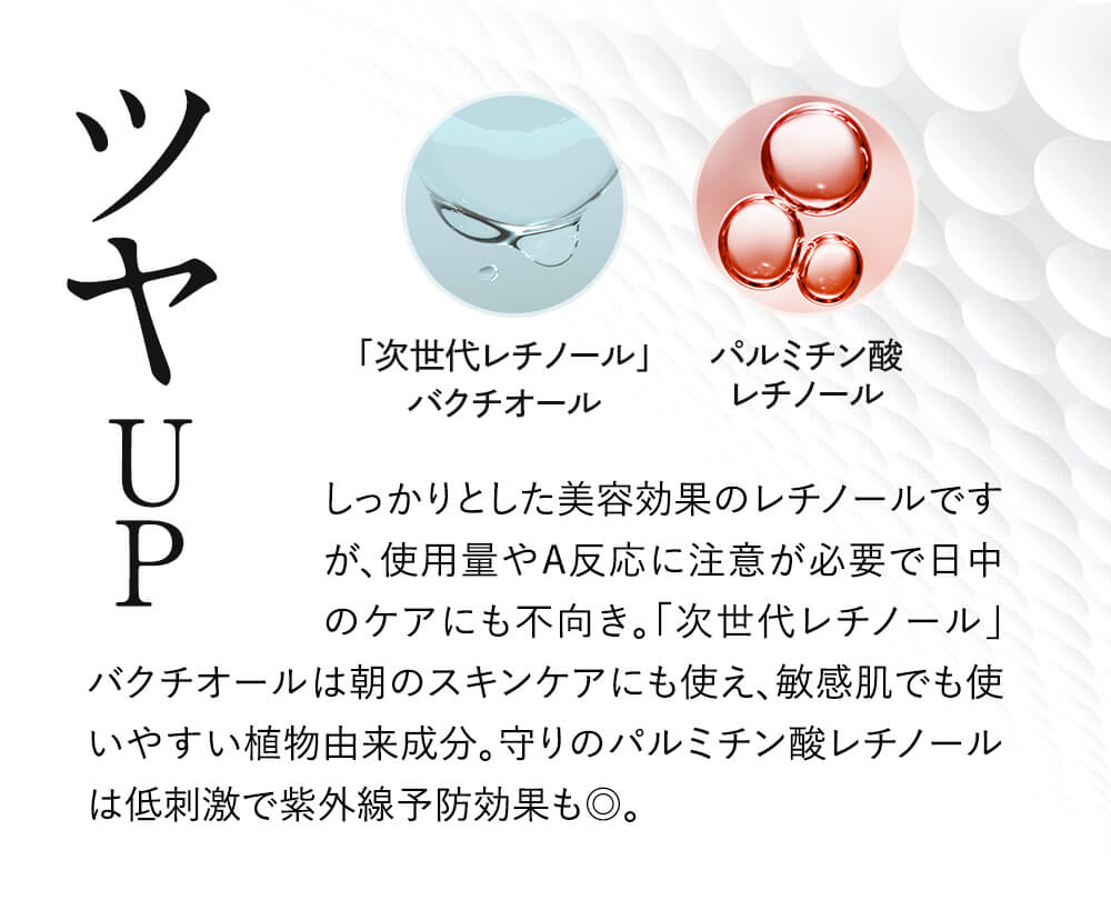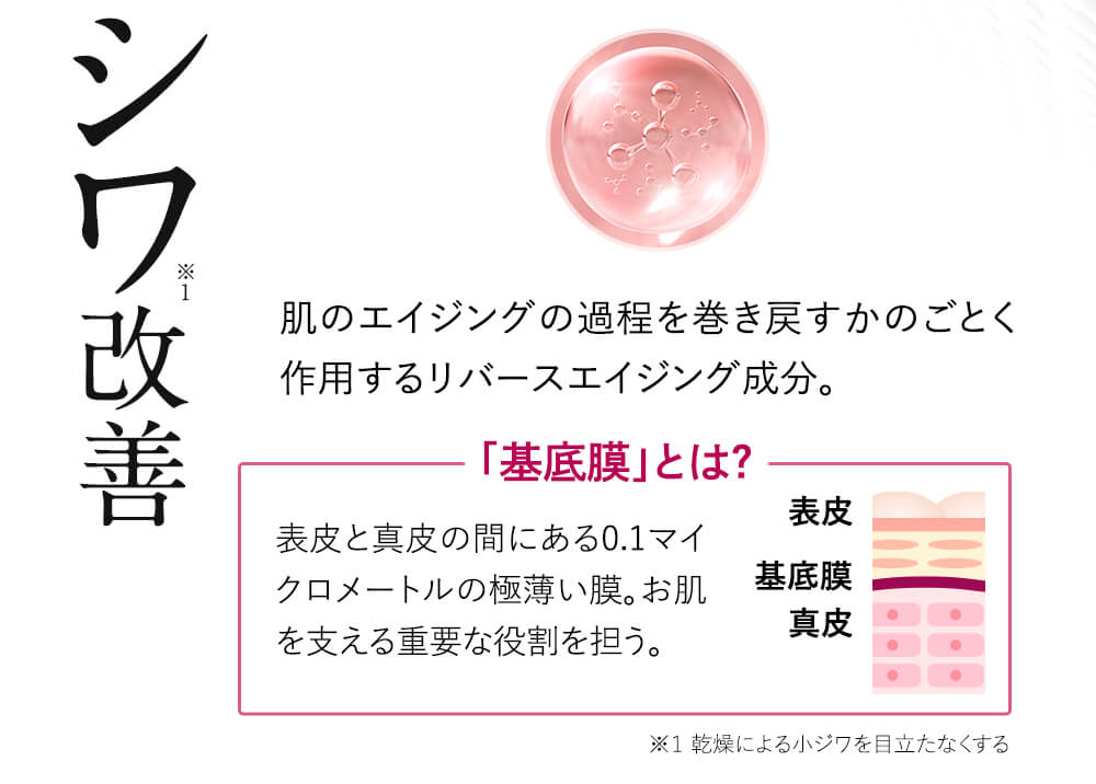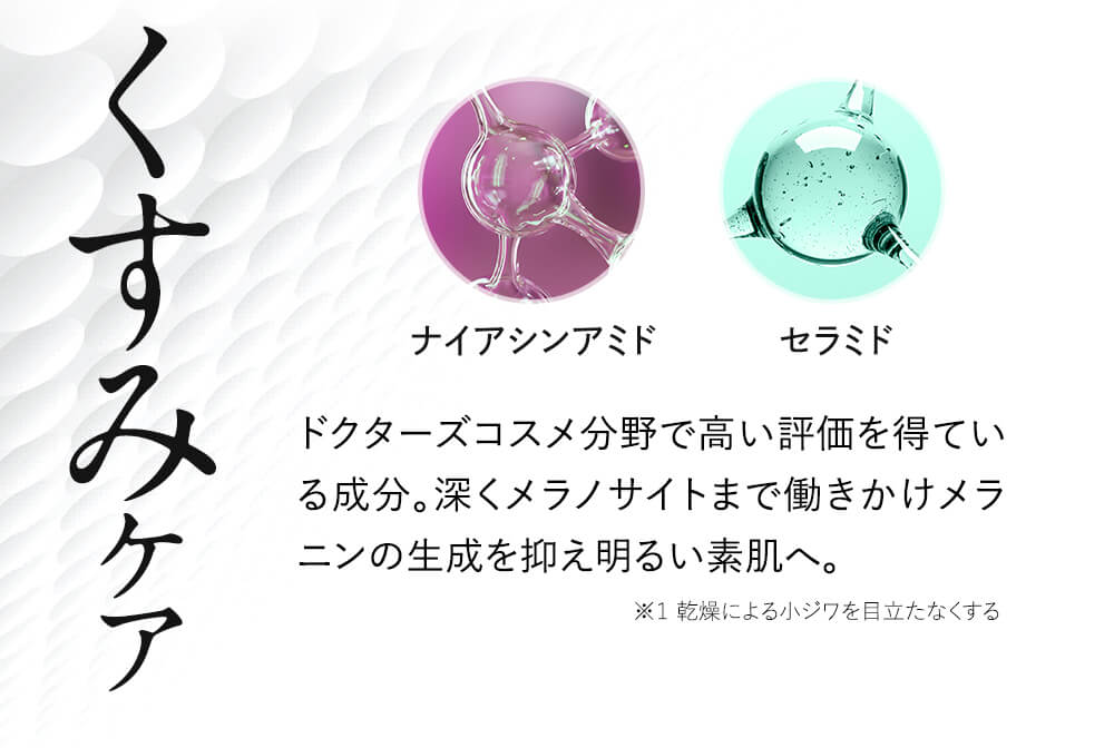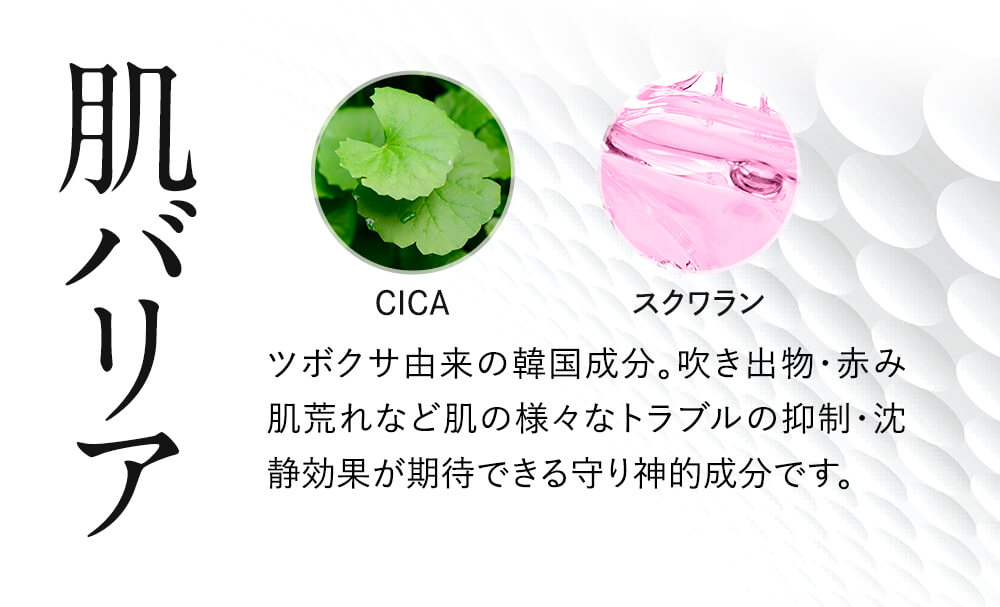 水、BG、(カプリル酸/カプリン酸/コハク酸)トリグリセリル、グリセリン、ペンチレングリコール、ナイアシンアミド、ヒアルロン酸Na、パルミチン酸レチノール、バクチオール、セラミドNP、セラミドNG、セラミドAP、スクワラン、水添レシチン、カプロオイルテトラペプチド-3、ツボクサエキス、ホホバ種子油、テリハボク種子油、ワサビノキ種子油、コーン油、クエン酸、メチルグルセス-10、ベタイン、エクトイン、フェノキシエタノール、硫酸Мg、クエン酸Na、キサンタンガム、ジェランガム、ポリクオタニウム-51、カルボキシメチルフェニルアミノカルボキシプロピルホスホン酸メチル、デキストラン、フィトステロールズ