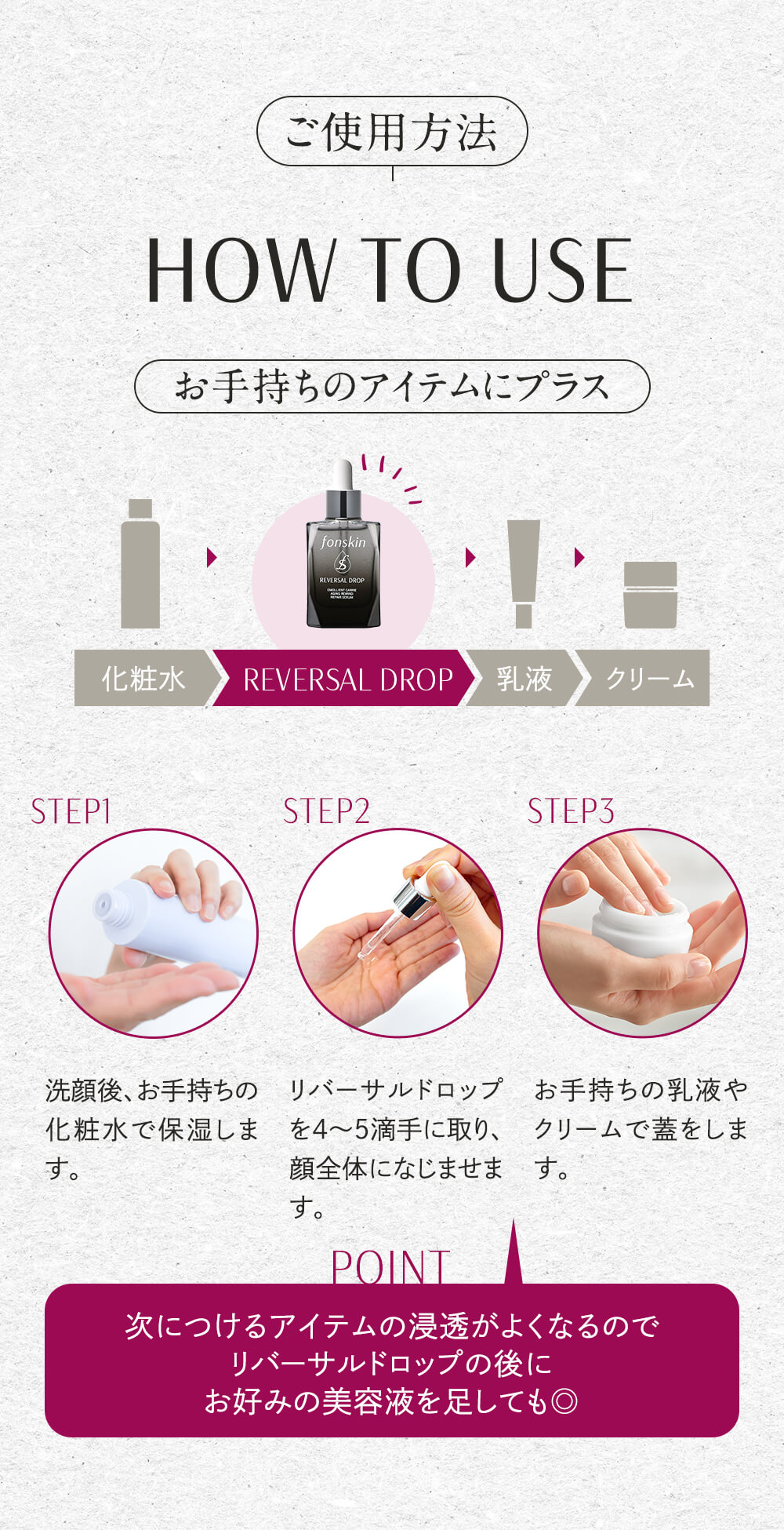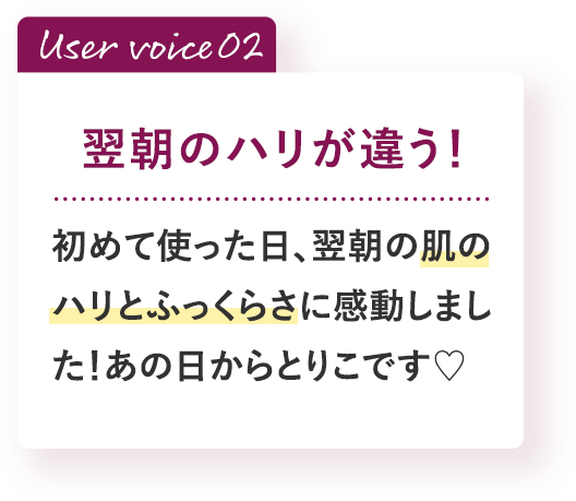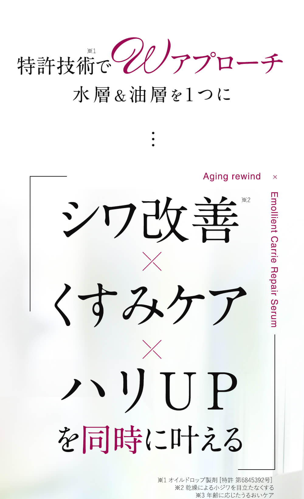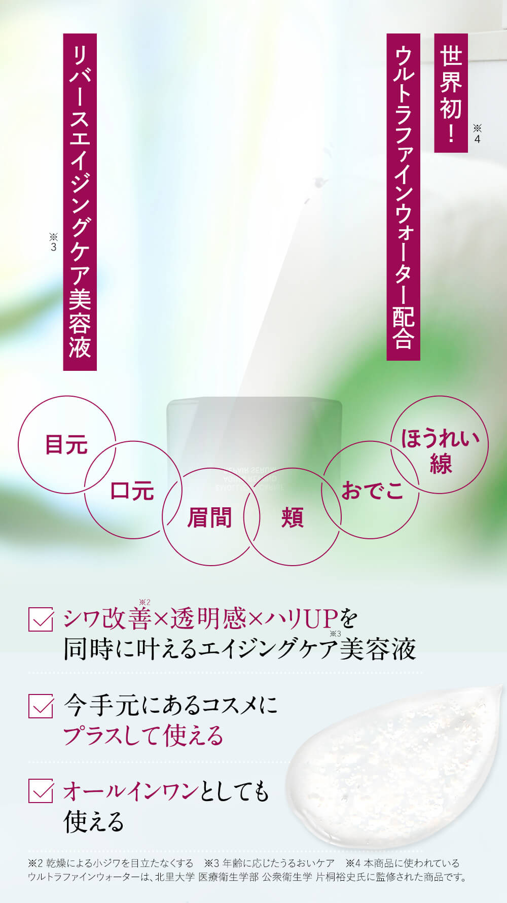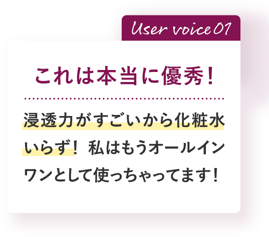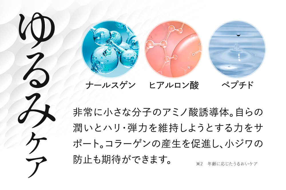 水、BG、(カプリル酸/カプリン酸/コハク酸)トリグリセリル、グリセリン、ペンチレングリコール、ナイアシンアミド、ヒアルロン酸Na、パルミチン酸レチノール、バクチオール、セラミドNP、セラミドNG、セラミドAP、スクワラン、水添レシチン、カプロオイルテトラペプチド-3、ツボクサエキス、ホホバ種子油、テリハボク種子油、ワサビノキ種子油、コーン油、クエン酸、メチルグルセス-10、ベタイン、エクトイン、フェノキシエタノール、硫酸Мg、クエン酸Na、キサンタンガム、ジェランガム、ポリクオタニウム-51、カルボキシメチルフェニルアミノカルボキシプロピルホスホン酸メチル、デキストラン、フィトステロールズ
