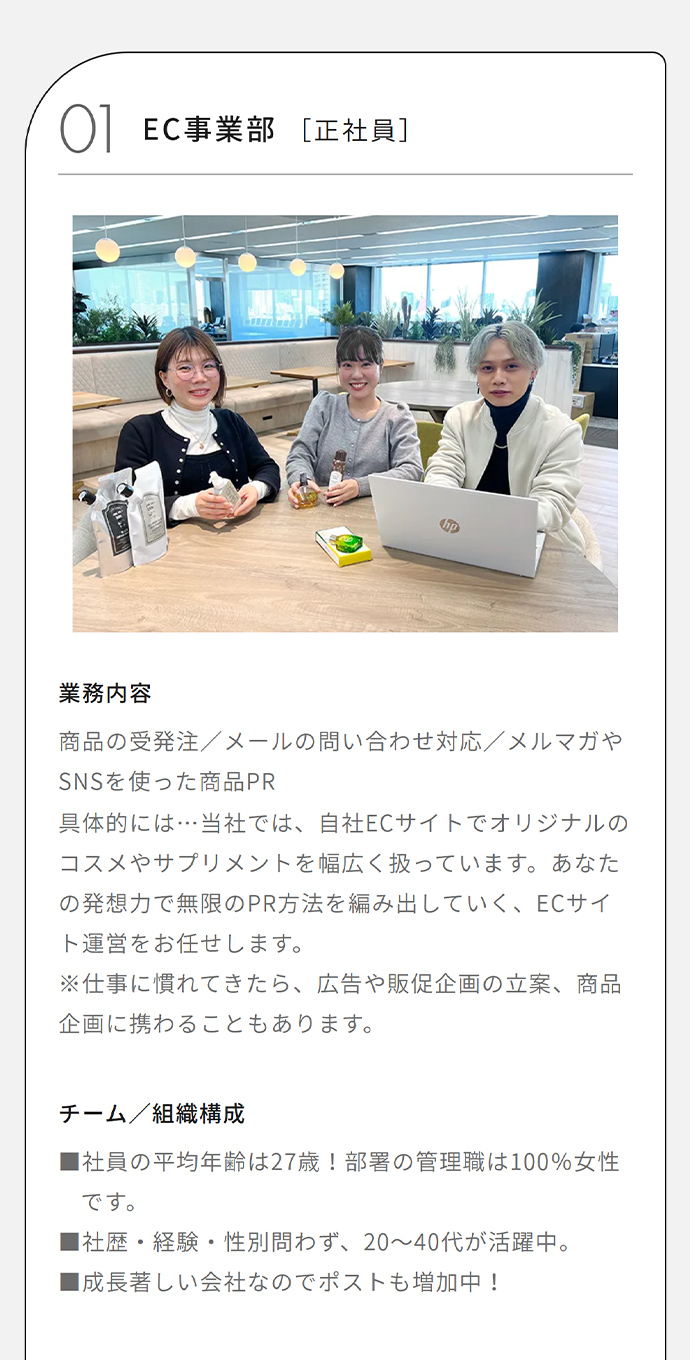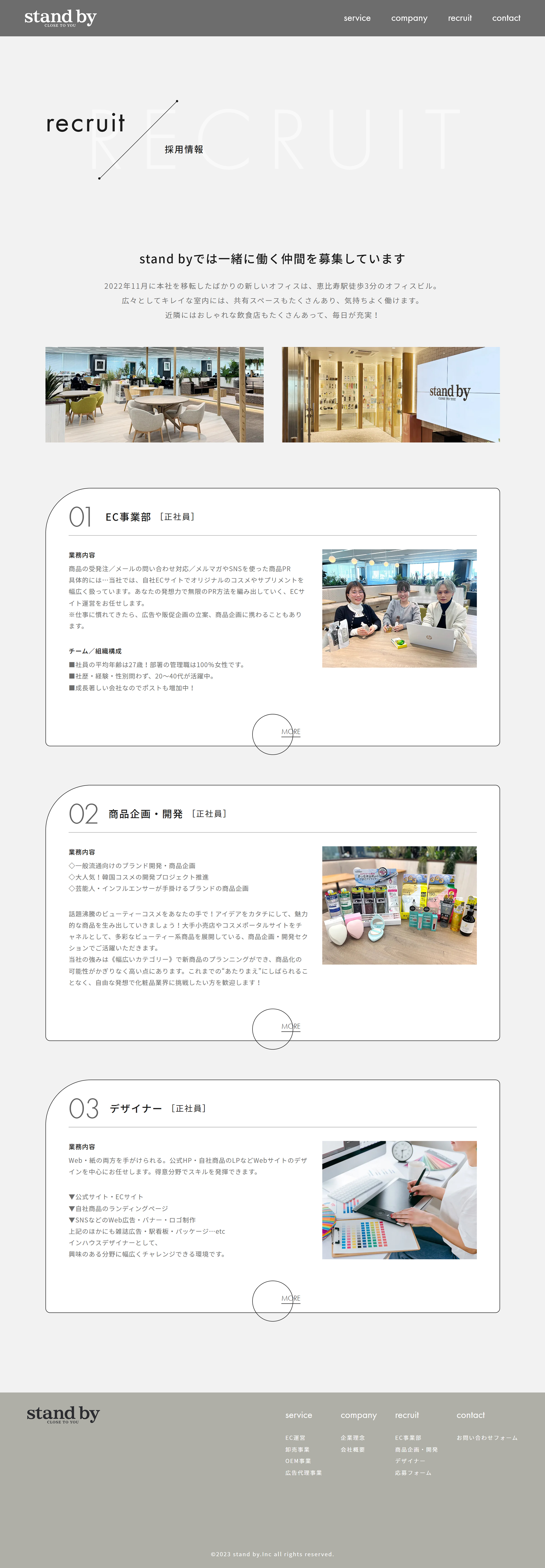 EC事業企業のコーポレートサイトです。スタイリッシュで洗練された雰囲気を感じられるようにデザインしました。企業の信頼感をしっかりと伝えるために、余白を活かした構成とトーンを統一したビジュアルを採用。ユーザーが欲しい情報にスムーズにたどり着けるよう、情報設計にも工夫を凝らしています。ブランドイメージを高めつつ、事業の成長に寄り添うサイトを目指しました。