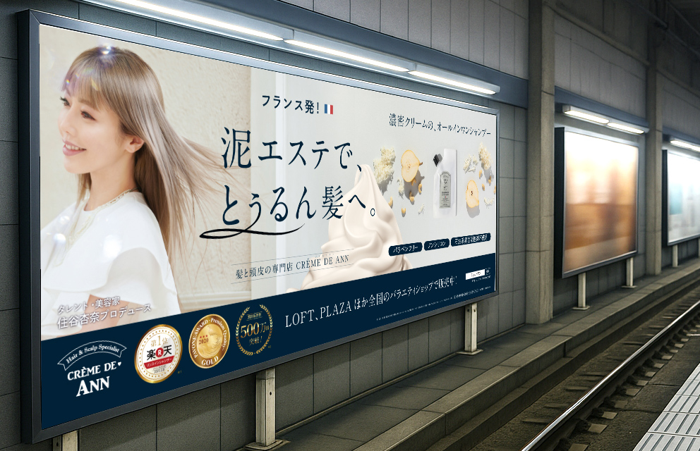 2018年誕生のヘアケアブランドの立ち上げから携わらせていただき、ロゴ・サイト・商品パッケージ・駅看板・商品撮影ディレクションなど、トータルでデザインさせていただきました。ブランドの世界観を視覚的に統一し、商品コンセプトがより強く伝わるよう細部まで設計。特にナチュラルかつ上質なイメージを重視し、ターゲット層に響く洗練されたビジュアルに仕上げています。複数のクリエイティブを一貫して制作することで、ユーザーの記憶に残るブランディングを実現しました。